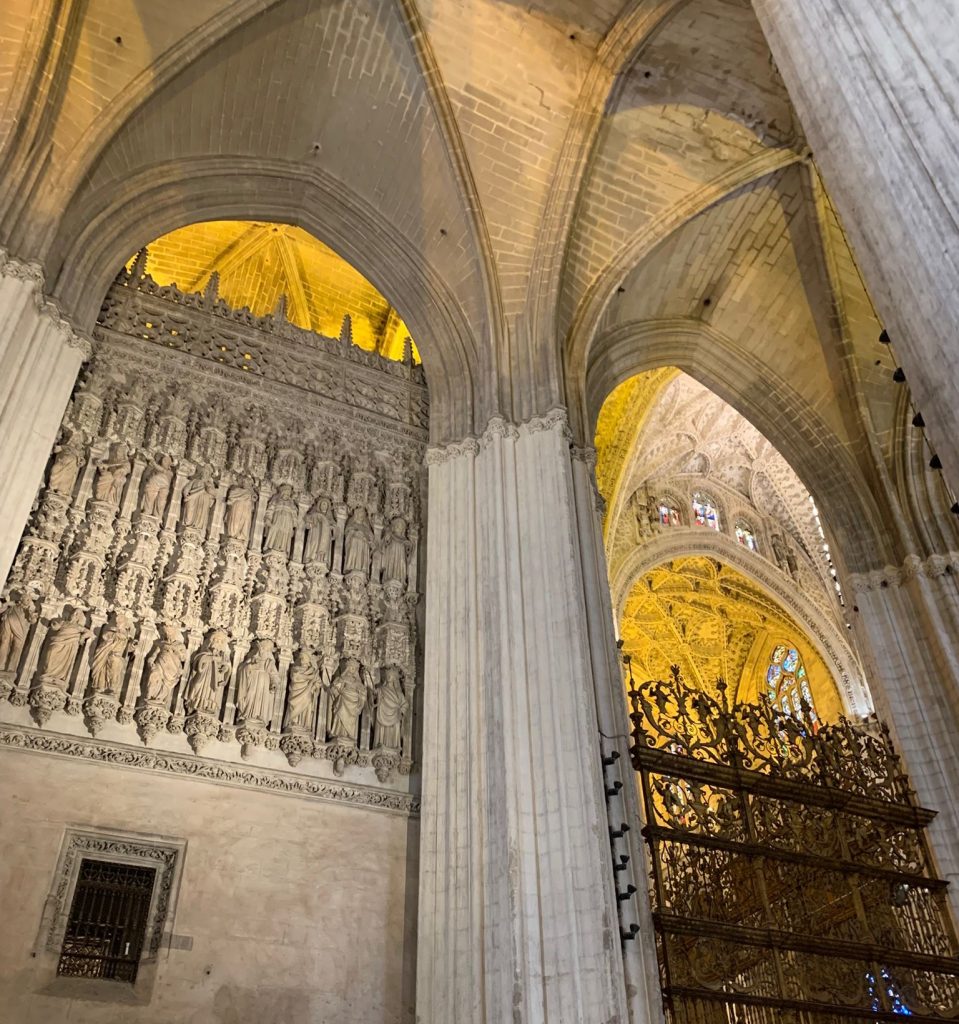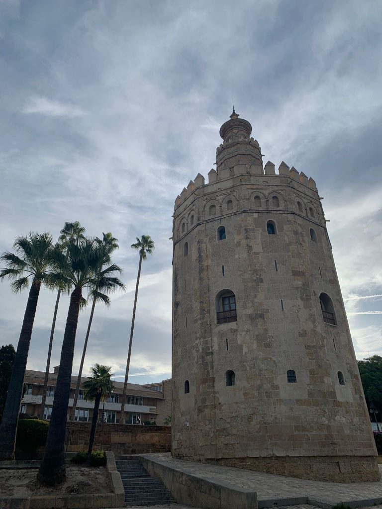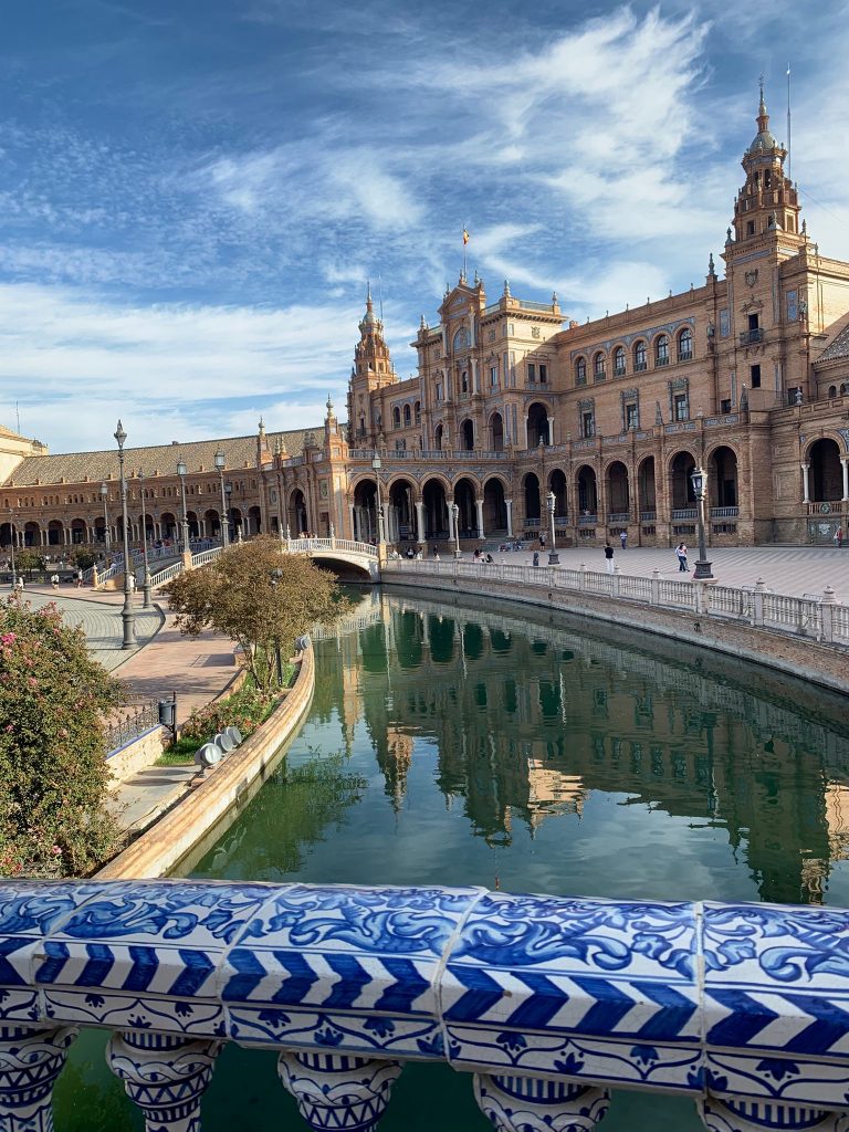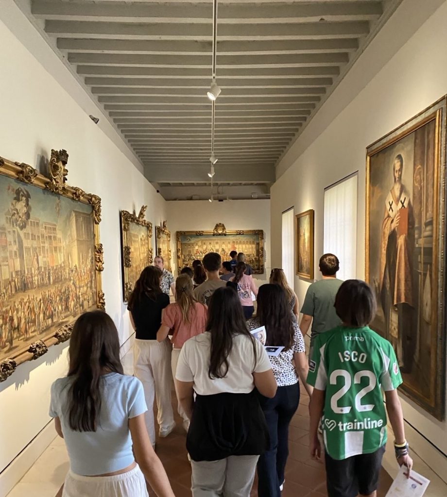 Anschließend haben wir auf der Plaza de España einen Arbeitsauftrag erhalten – wir sollten den Platz erkunden und Fotos von den spanischen Kolonien machen, die in einem Mosaik dargestellt sind. Anschließend sind wir zu einer Kirche namens Catedral y Giralda gelaufen. Diese ist sehr bekannt. Dort mussten wir als erstes durch eine Sicherheitskontrolle und haben dann ein Booklet mit Arbeitsaufträgen bekommen, die wir in der Kirche bearbeiten sollten. Anschließend durften wir den Turm namens Giralda erklimmen. Dieser erinnert an marokkanische Türme. Aus Sicherheitsgründen dürfen nur Kinder ab 14 Jahren auf den Turm, also war es für uns erlaubt. Von oben konnte man die ganze Stadt überblicken.