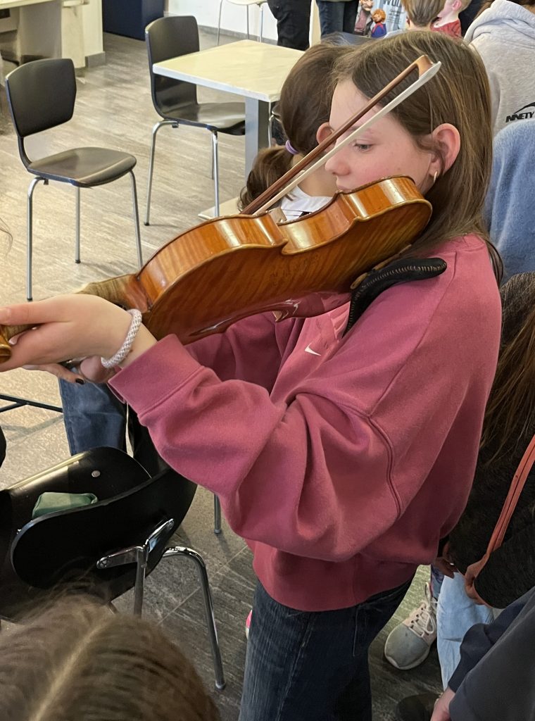 Besonders spannend für viele unserer Schüler:innen: Im Anschluss gab es für alle interessierten Kinder noch die Möglichkeit verschiedene Instrumente auszuprobieren, was auch ausgiebig genutzt wurde.