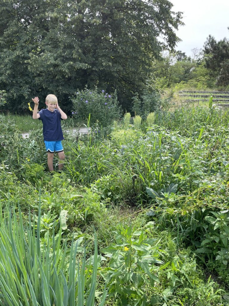 Nachdem es zu Beginn der Sommerferien sehr heiß war und man kaum mit dem Gießen nachkam, war es mitten in den Sommerferien in Darmstadt eher feucht. Der Wechsel aus Sonne und Regen ließ nicht nur die Ernte explodieren, sondern auch das Unkraut. Schaut mal auf den Fotos, wie der Schulacker gegen Ende der Sommerferien aussieht…