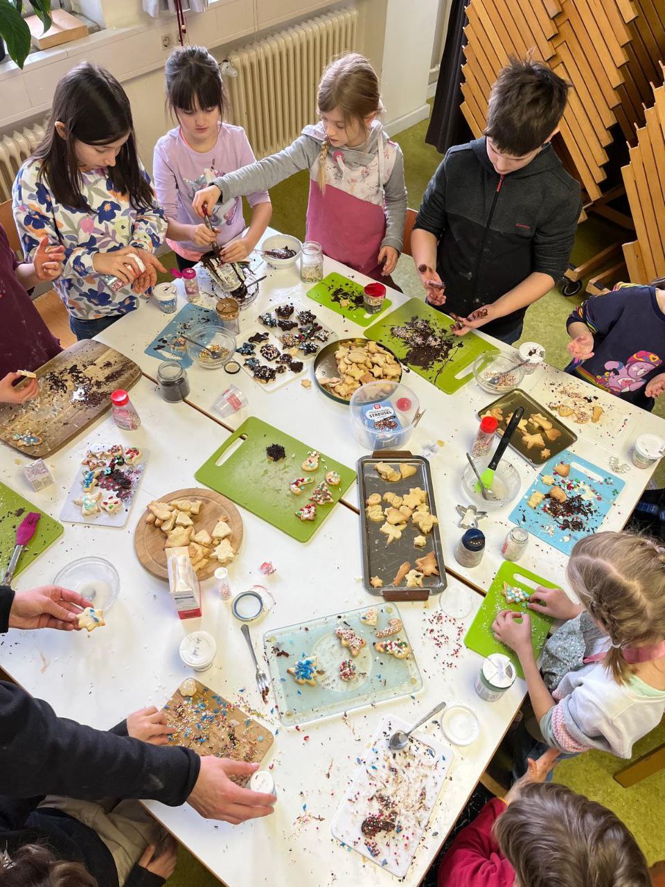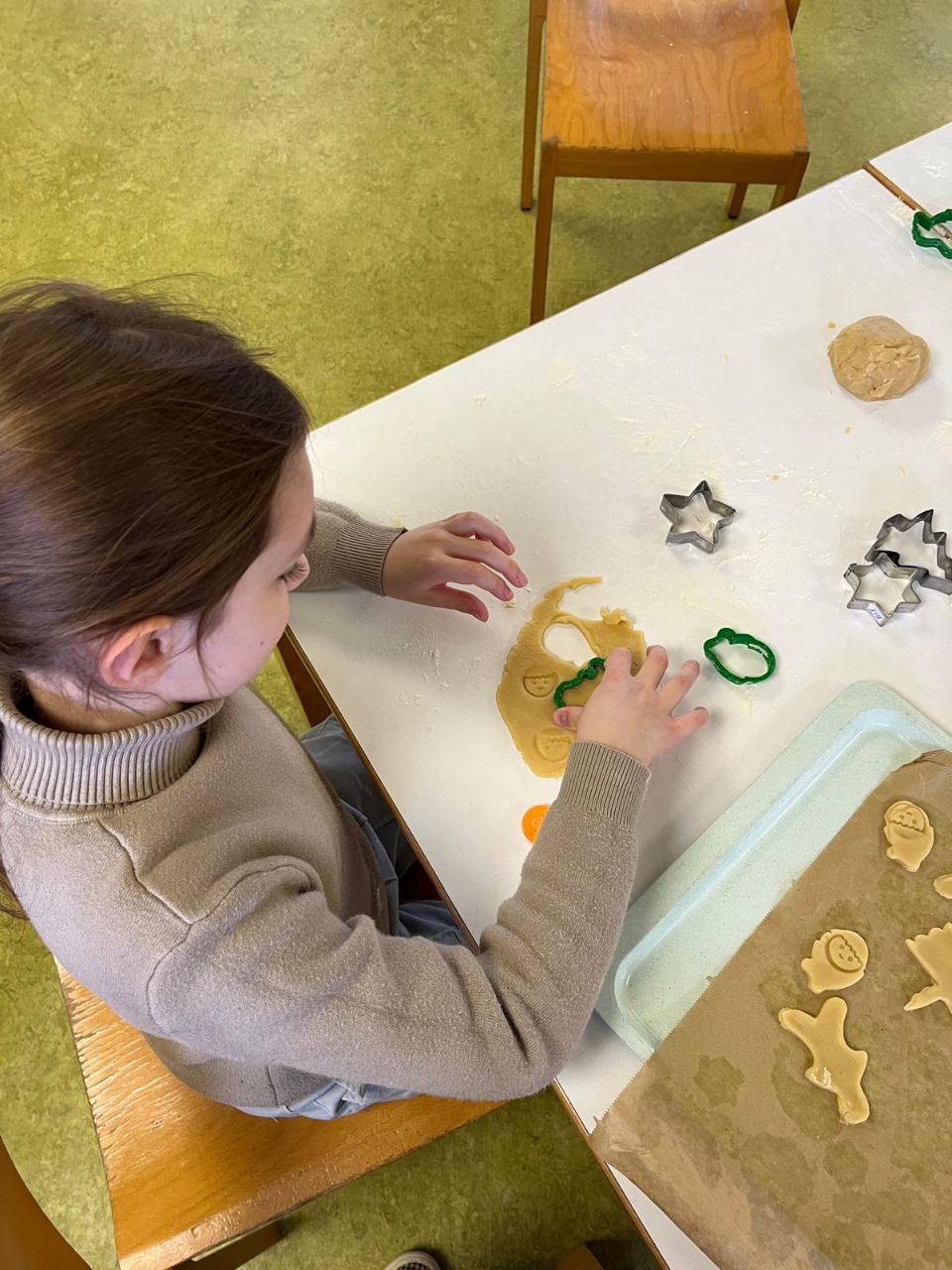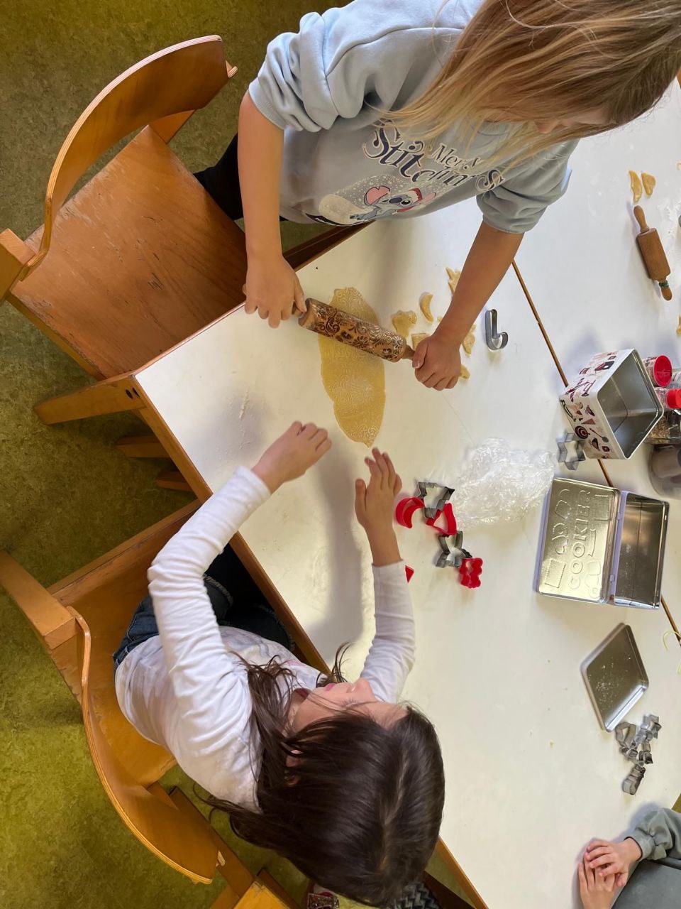 An den vorbereiteten Backtischen fanden die Kinder ihren Platz und gemeinsam rollten wir den Teig aus und wählten Ausstecher in allen möglichen Formen – von Weihnachtsstern bis Rentier mit fragilem Geweih. Ein Blech nach dem anderen wanderte in den Ofen und die ausgestochenen Plätzchen wurden goldbraun gebacken.