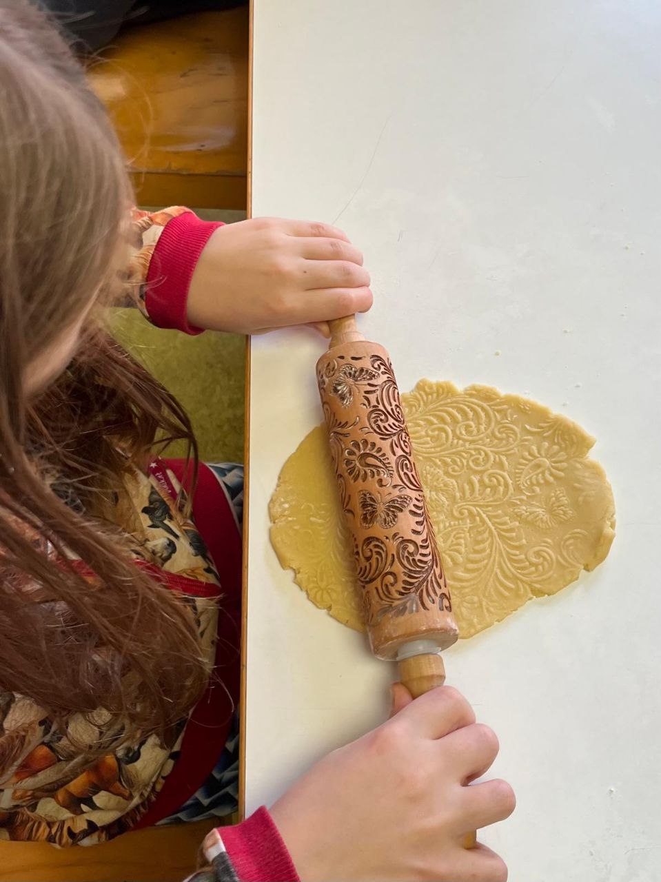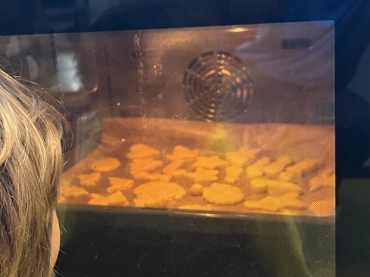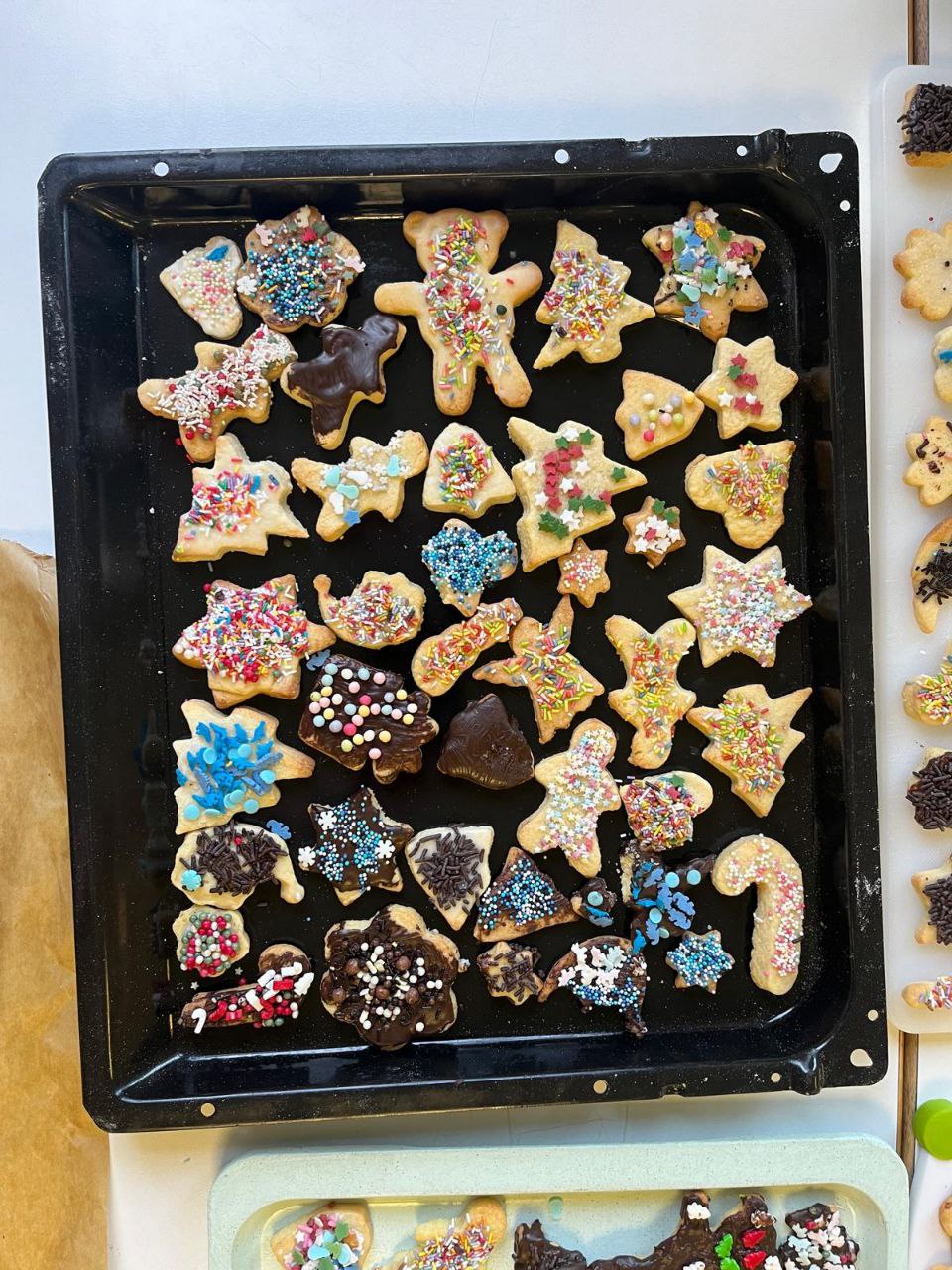 An den vorbereiteten Backtischen fanden die Kinder ihren Platz und gemeinsam rollten wir den Teig aus und wählten Ausstecher in allen möglichen Formen – von Weihnachtsstern bis Rentier mit fragilem Geweih. Ein Blech nach dem anderen wanderte in den Ofen und die ausgestochenen Plätzchen wurden goldbraun gebacken.