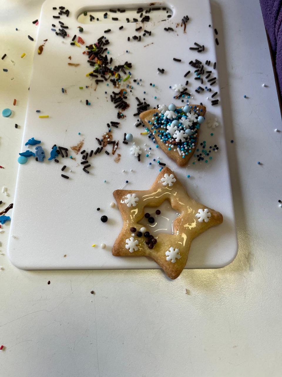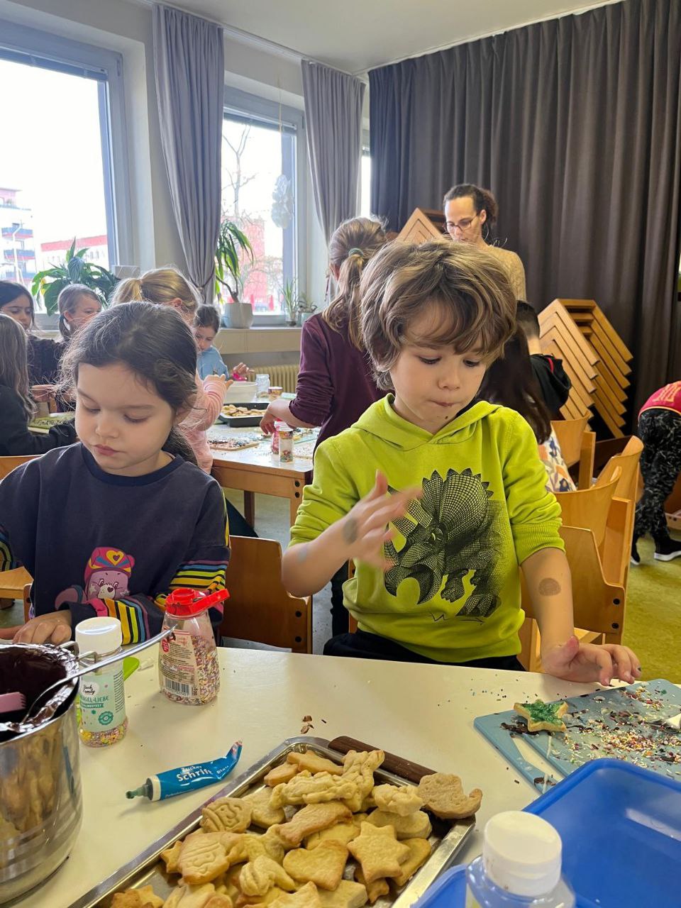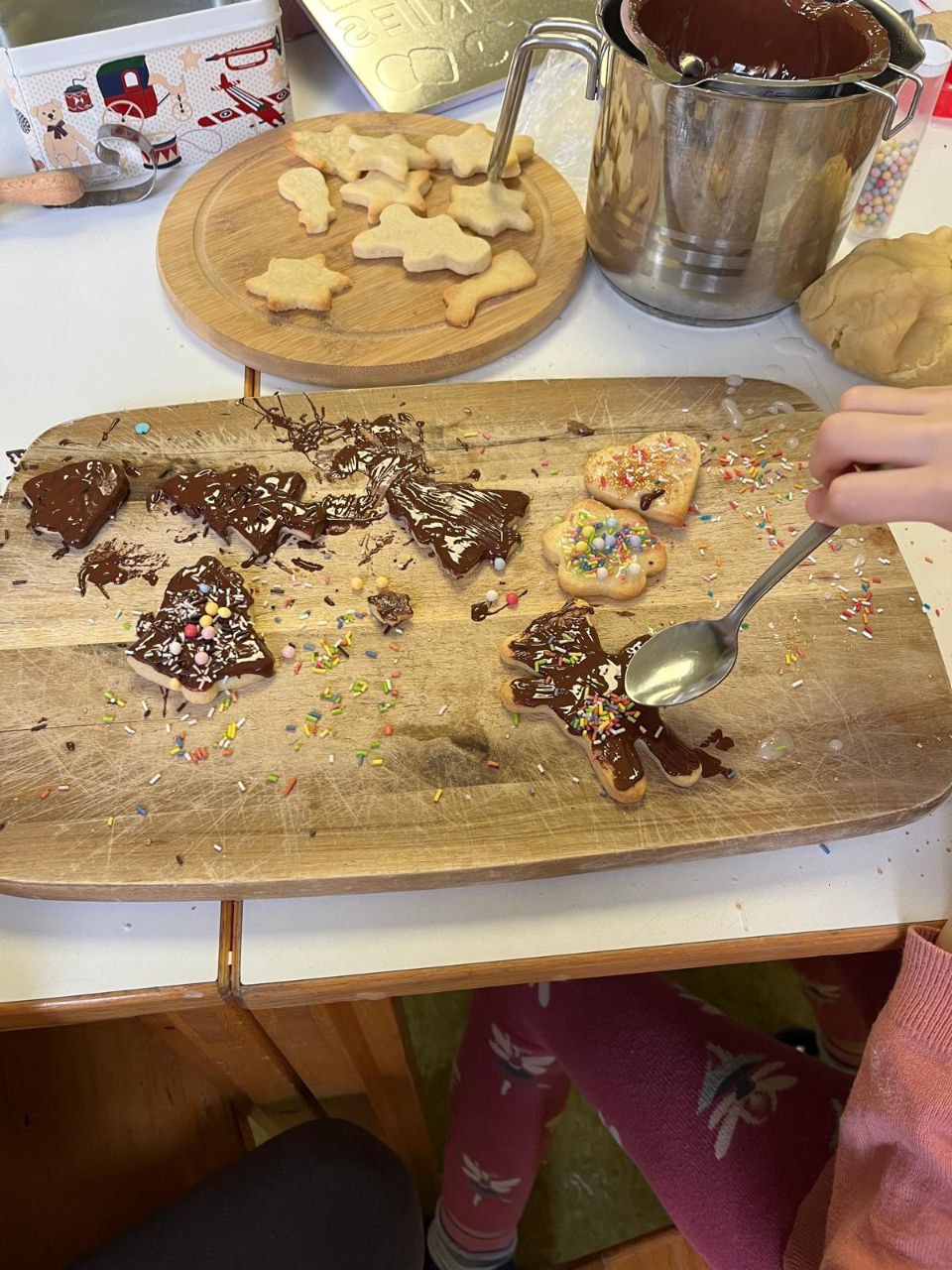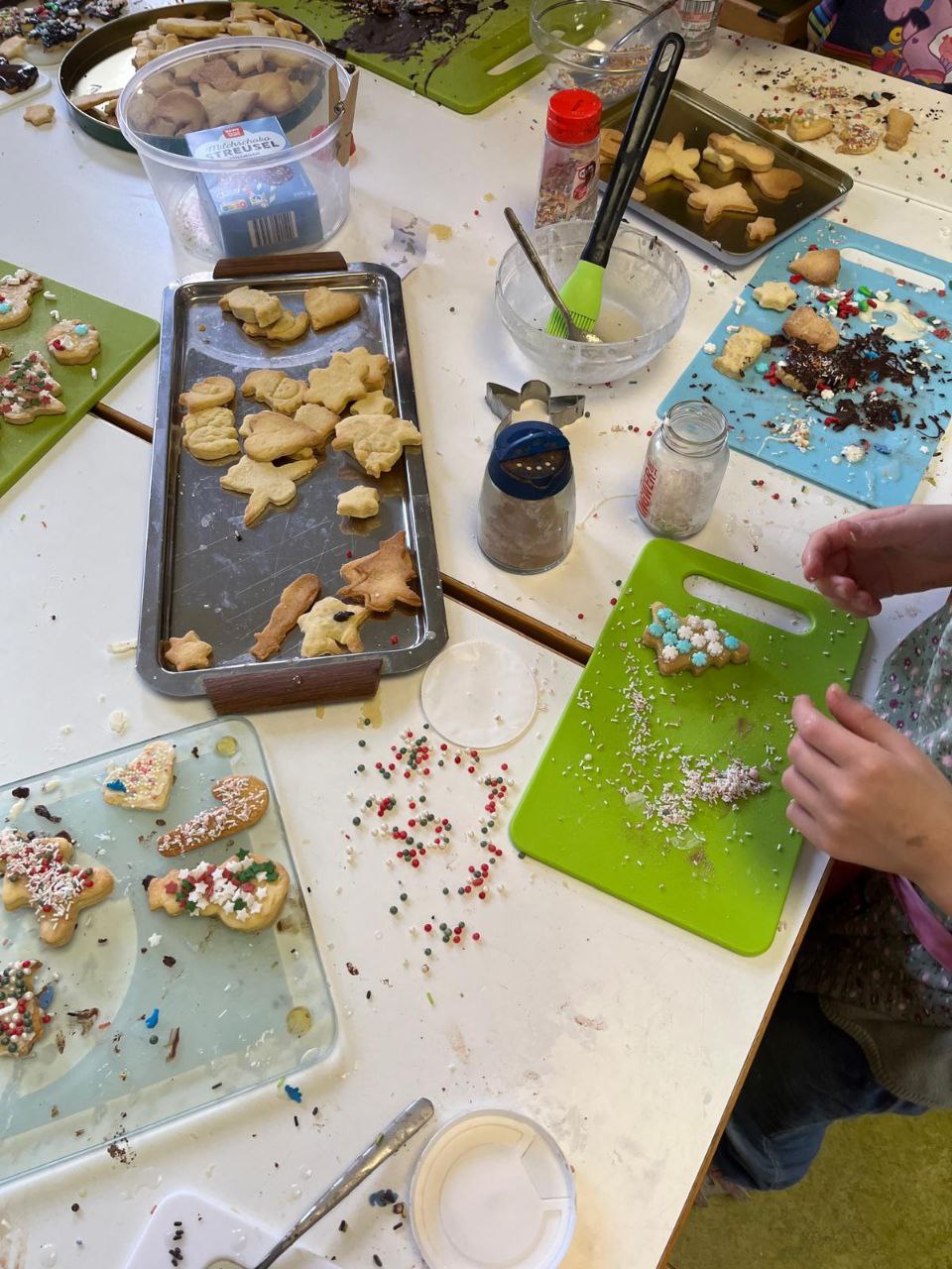 Vor allem das Verzieren machte allen riesigen Spaß: Streusel in allen Farben, geschmolzene Schokolade und süßer Zuckerguss flogen durch die Luft. Etwa zwei Drittel landete nicht auf den Plätzchen, sondern direkt auf den Händen – und von dort oft gleich im Mund. Der Arbeitstisch verwandelte sich in ein glänzendes Kunstwerk aus Guss und Krümeln, unwiderstehlich zum Naschen. Und natürlich verschwanden auch abgebrochene Weihnachtsmännerarme und Stücke von Rudolfs Geweih ohne Zögern in den Bäuchen der kleinen Bäcker:innen.